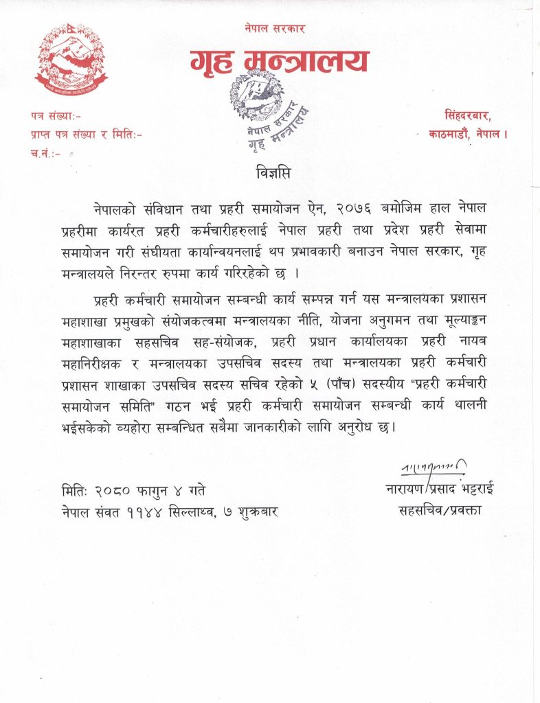 मन्त्रालयका प्रहरी कर्मचारी प्रशासन शाखाका उपसचिव सदस्य–सचिव रहने गरी पाँच सदस्यीय समिति गठन गरेको विज्ञप्तिमा उल्लेख छ । कानुनअनुसार ‘प्रहरी कर्मचारी समायोजन समिति’ बनाएर समायोजन शुरु भएको गृह मन्त्रालयका प्रवक्ता नारायणप्रसाद भट्टराईले जानकारी दिए ।