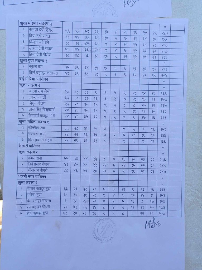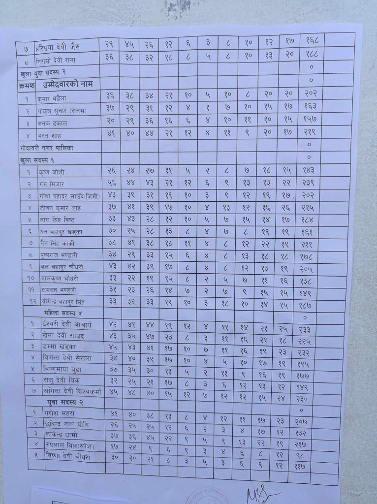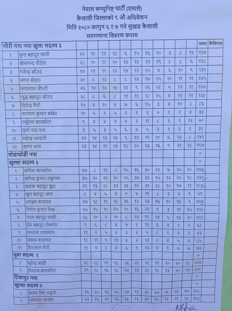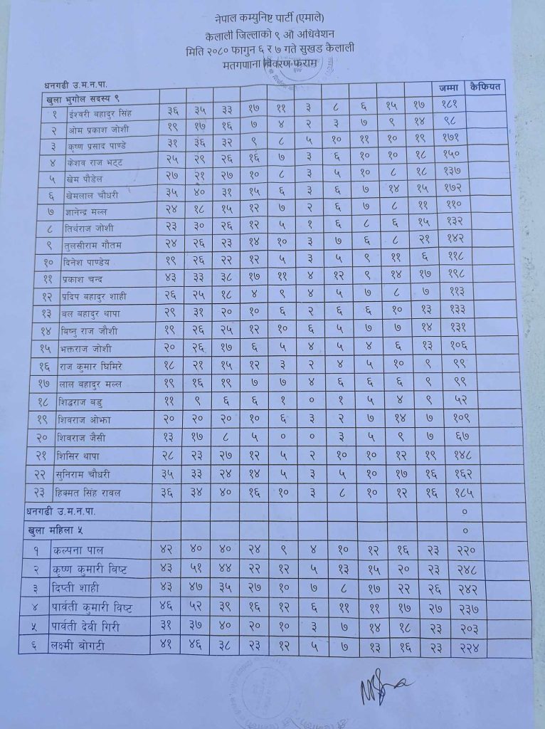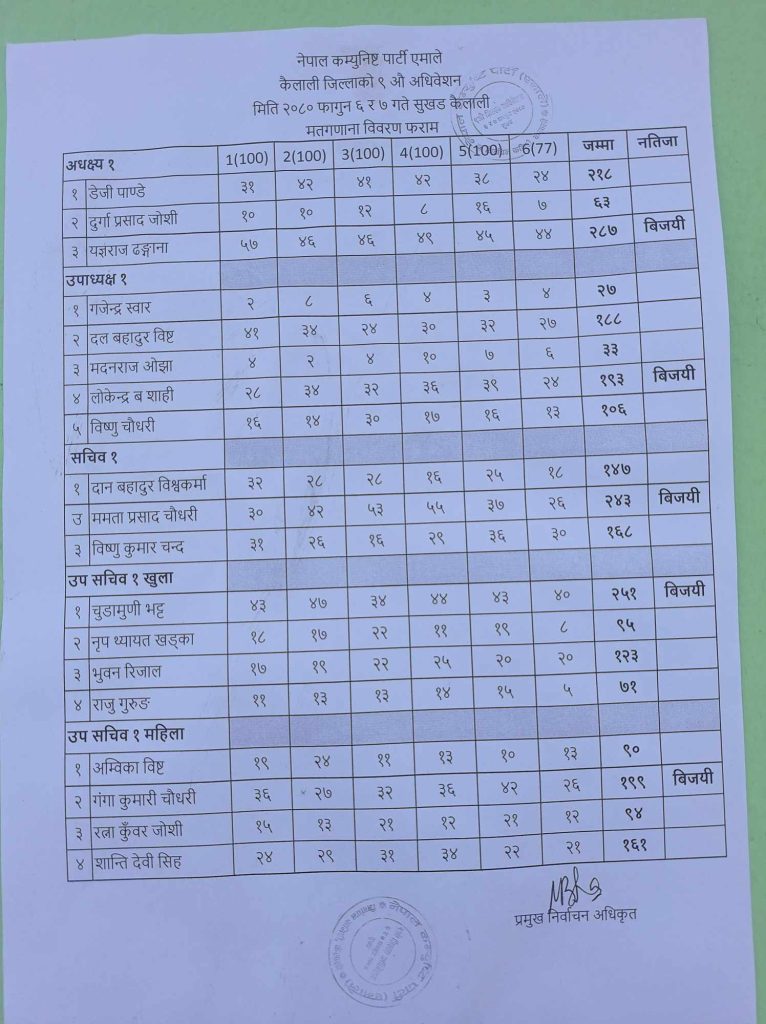 धनगढी । नेकपा (एमाले) कैलाली जिल्ला नेतृत्वको लागि भएको निर्वाचनको अन्तिम परिणाम आइसकेको छ । पदाधिकारीहरूको हिजै परिणाम सार्वजनिक गरिए पनि सदस्यहरूको मत परिणाम भर्खरै सार्वजनिक गरिएको हो । अध्यक्षमा यज्ञराज ढुंगाना र सचिवमा ममता प्रसाद चौधरी विजयी भएका छन् ।
