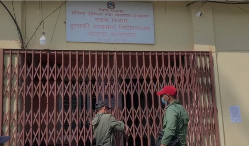 हुलाकी राजमार्ग निर्देशनालय योजना कार्यालय, धनगढीमा क्रान्तिकारी युवा संगठनले शुक्रवार बिहान ताला लगाएको हो । कञ्चनपुरमा हुलाकी सडक निर्माणको ठेक्का पाएको राजेन्द्र निर्माण सेवा र बाबा हंस सिद्धिकी शाहीलाई कर्मचारीले संरक्षण गरेको आरोप संगठनको छ ।