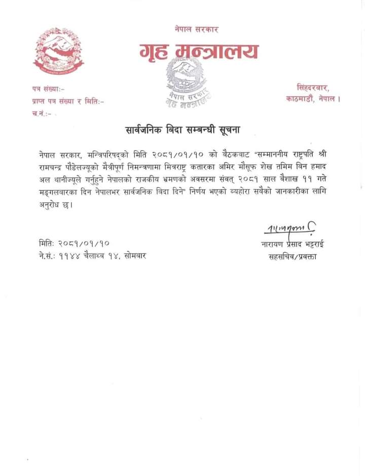 काठमाडौँ । कतारको राजाको सम्मानमा भोलि (मंगलबार) सार्वजनिक विदा दिइने निर्णय भएको छ।