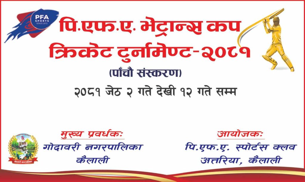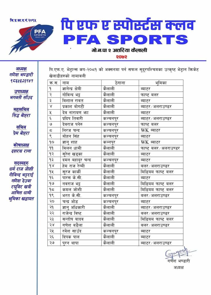टीकापुर । कैलालीको अत्तरियामा आयोजना हुन गइरहेको पाँचौ संस्करणको भेट्रान कप क्रिकेट प्रतियोगिताको अक्सनमा परेका खेलाडीहरुको नाम सार्वजनिक गरिएको छ । आयोजक संस्था पिएफए स्पोट्र्स क्लबले प्रतियोगीतामा अक्सन मार्फत खरिद विक्रिका लागि २७ जना खेलाडीहरुको नाम सार्वजनिक गरेको हो ।
