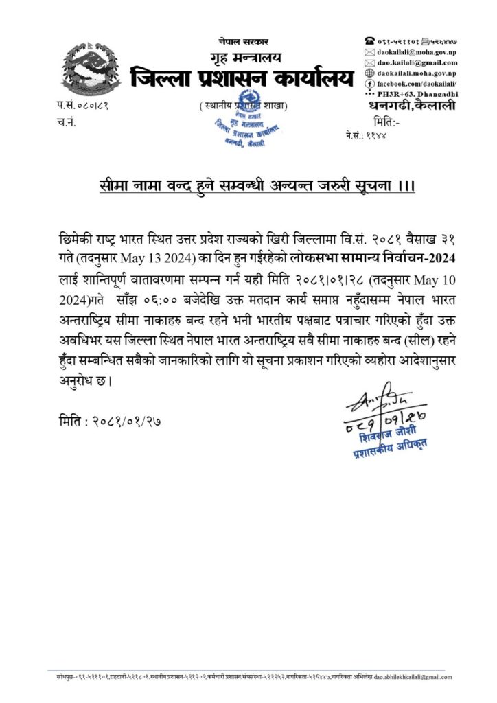 वैशाख ३१ गते भारतको उत्तर प्रदेश राज्यको खिरी जिल्लामा लोकसभा सामान्य निर्वाचन हुने भएपछि सीमा नाका बन्द हुने भएको हो ।