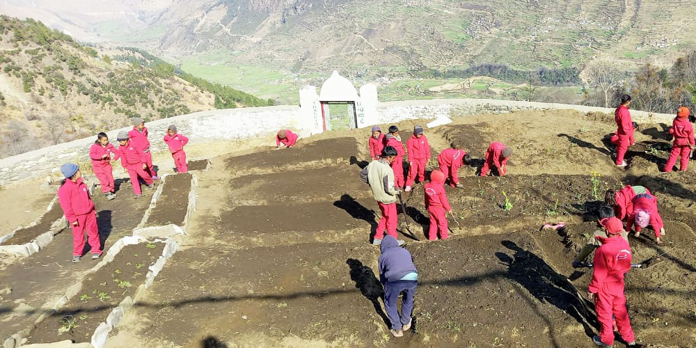 उहाँले भन्नुभयो, “विद्यालय वरिपरि धेरै जमिन छ । दुइ वर्षदेखि हामीले त्यो सबै जमिनमा तरकारी लगाउँदै आएका छौं ।” हामी सबै विद्यालयमा बस्छौं । विद्यालयमै खान सुत्नको राम्रो व्यवस्था छ । त्यसैले दिवा खाजा तथा बिहान बेलुकीको खाना सहज हुने गरी अहिले हामीले विद्यालयमै तरकारी उत्पादन गर्न थालेको छाैं, गुरुङले भन्नुभयो ।